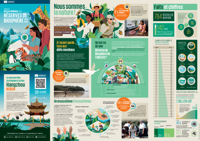 Le document contient une carte et une infographie présentant le Réseau mondial des réserves de biosphère. On y définit ce qu'est une Réserve de Biosphère de l'UNESCO en y situant les liens entre l'humain et la nature, les faits saillants et statistiques du réseau, ainsi qu'une brève présentation du Plan stratégique d'action Hangzou 2026-2035.
