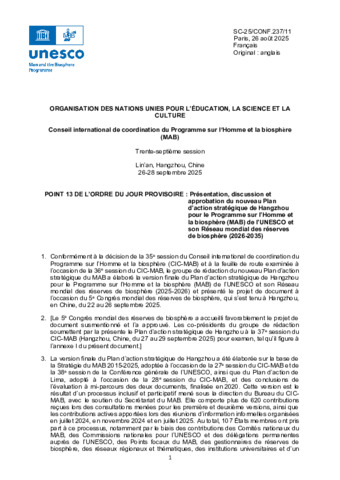 UNESCO (2025). Plan d’action stratégique de Hangzhou pour le Programme sur l’Homme et la Biosphère (MAB) de l’UNESCO et le Réseau mondial de réserves de biosphère (RMBR) (2026-2035). [Document de travail]
